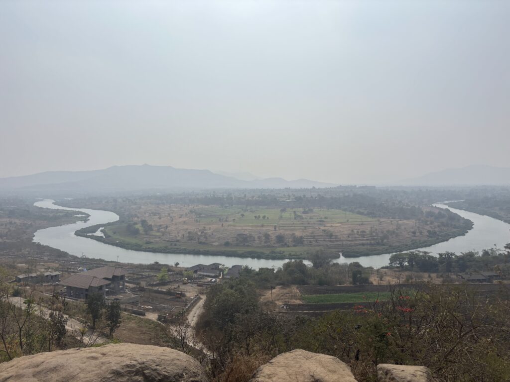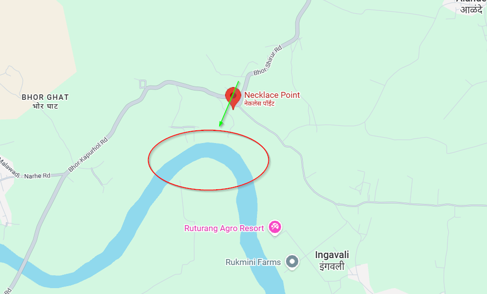 Necklace Point is a lesser-known scenic viewpoint near Bhor, close to the Pune–Satara highway. It’s a A hillside viewpoint overlooking a dramatic horseshoe-shaped bend in the river Nira.The spot gets its name from the distinctive necklace-shaped curve formed by the river below, which becomes visible only when you walk to the edge of the viewpoint.